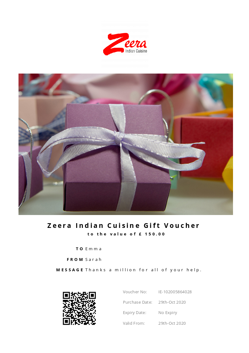 Zeera Indian Cuisine allows you to purchase instantly printable gift vouchers, special offers and tickets using the Voucher Connect platform.